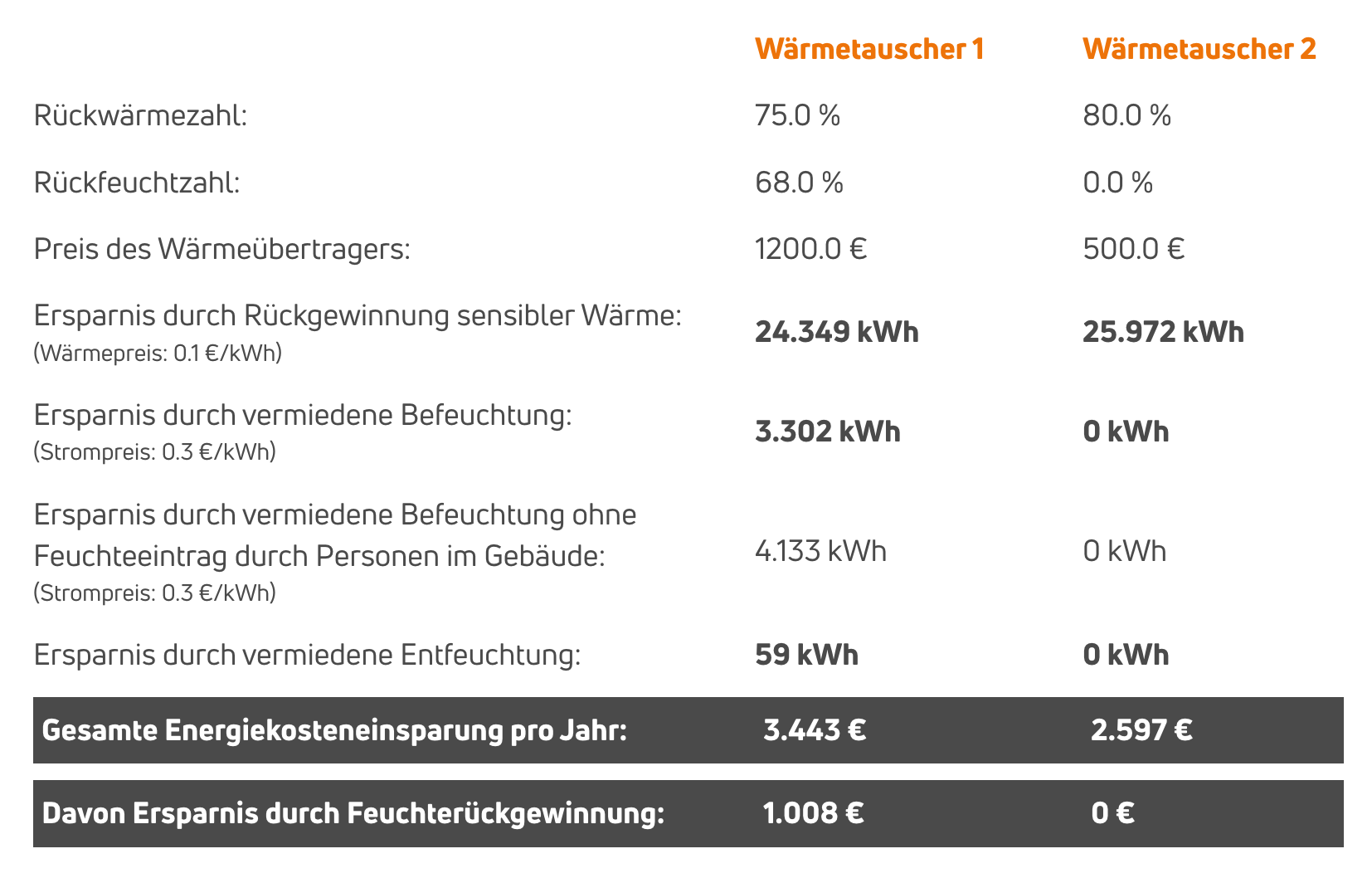 Wärmetauscher 1 (Enthalpie): Gesamte Energie- und Kosteneinsparung pro Jahr: 3’446 Euro, davon 1’008 Euro durch Feuchterückgewinnung.