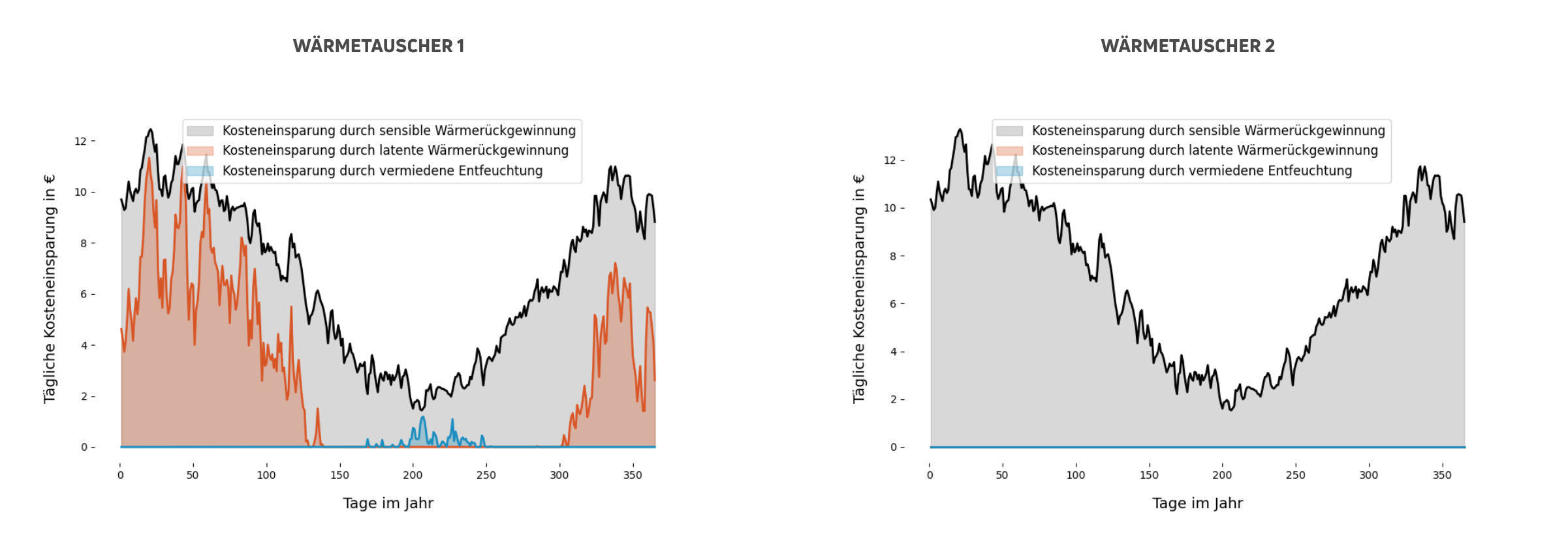 Obwohl die Rückgewinnung fühlbarer Wärme bei Wärmetauscher 2 höher ist, zeigt sich deutlich, dass Wärmetauscher 1 durch seine Fähigkeit zur Feuchterückgewinnung über das Jahr hinweg insgesamt höhere Energieeinsparungen erzielt – was zu signifikanten Kosteneinsparungen führt.