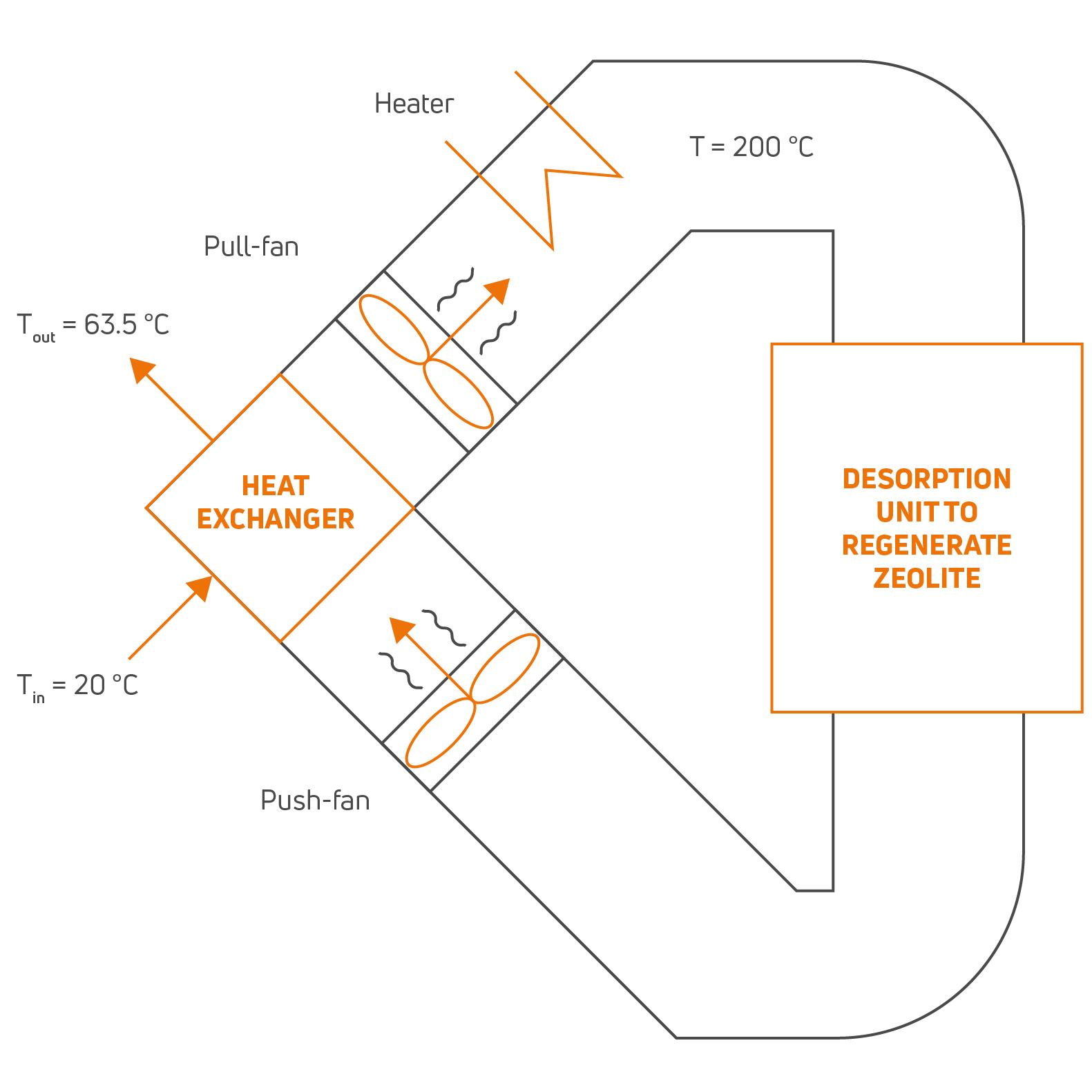 The desorption unit contains zeolite, whose surface has been saturated with CO₂ during the absorption process to produce low-CO₂ air. To regenerate the zeolite, the bound CO₂ must be released. This is achieved by heating air via a heat exchanger, raising it to the required temperature using a heater, and then directing it into the desorption process.