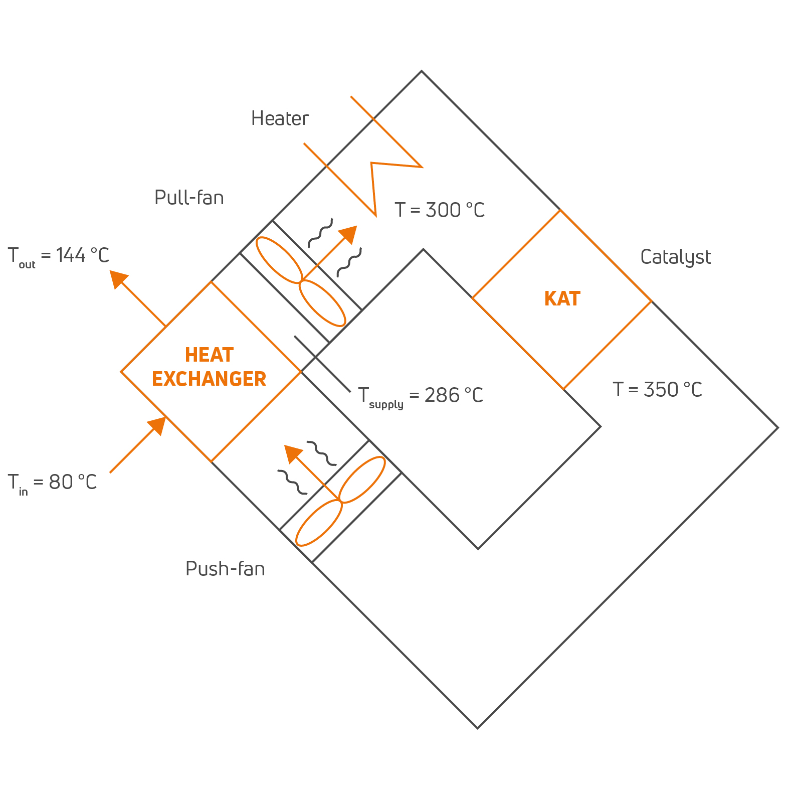 The exhaust gas to be cleaned is first preheated by the exhaust air flow before entering the catalytic cleaning process. A heater raises the exhaust gas to the required reaction temperature. In the catalytic converter, the exhaust gas undergoes an exothermic reaction. The purified exhaust air, now at an elevated temperature, transfers its energy to the colder supply air via a heat exchanger, achieving efficiencies of up to 80%.